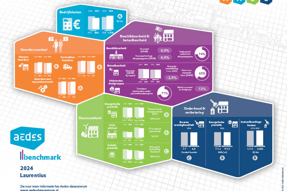 Om het huurdersoordeel te meten, kijkt Aedes naar de drie belangrijkste contactmomenten: als bewoners naar een woning verhuizen, bij een reparatieverzoek en als bewoners verhuizen naar een ándere woning. Laurentius scoort bovengemiddeld bij deze eerste twee onderdelen, een A score. Ook bleven onze bedrijfslasten relatief laag. Daar zijn wij heel blij mee! Hieronder ziet u de infographic met een overzicht van onze totaalscore.